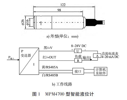 頂裝型磁翻板液位計(jì)以微處理器為核心單元,具有檢測(cè)、判斷和信息處理功能。其測(cè)量水位的基本原理是利用半導(dǎo)體硅材料的壓阻效應(yīng),實(shí)現(xiàn)液位壓力與電信號(hào)的轉(zhuǎn)換[2]。即把與液體深度成正比的液體靜壓力,通過液位計(jì)( 變送器) 轉(zhuǎn)換成電流信號(hào)輸出,從而建立輸出電信號(hào)與液體深度的線性對(duì)應(yīng)關(guān)系,實(shí)現(xiàn)對(duì)液位( 水位) 的測(cè)量。沉箱水位監(jiān)測(cè)選用MPM4700 型頂裝型磁翻板液位計(jì),該液位計(jì)以擴(kuò)散硅壓阻式傳感器為管芯,集成變換器電路、微處理芯片為一體,其性能穩(wěn)定,結(jié)構(gòu)緊湊,外圍線路簡(jiǎn)單。該液位計(jì)為四線制,可同時(shí)輸出一組4 ~ 20 mA 的標(biāo)準(zhǔn)電流信號(hào)和RS486 數(shù)字信號(hào)。MPM4700 型智能