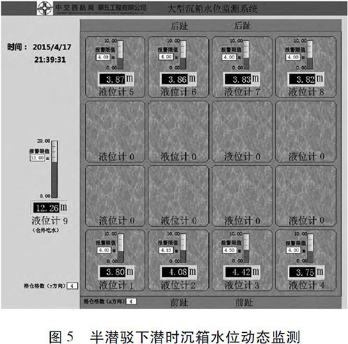 漳州后石港區(qū)3 號(hào)泊位碼頭工程采用重力式沉箱結(jié)構(gòu),該工程沉箱共15 件,單件質(zhì)量4 365 t,沉箱長(zhǎng)、寬、高分別為19. 8、21. 9 、25. 0 m; 沉箱分7 層澆筑,澆筑*頂層時(shí)3# 格倉(cāng)按設(shè)計(jì)圖紙預(yù)留3 m 高的缺口。在漳州預(yù)制廠預(yù)制,沉箱安裝施工現(xiàn)場(chǎng)距離預(yù)制廠約6. 3 km。沉箱采用氣囊橫移至出運(yùn)通道,再縱移至出運(yùn)碼頭前沿線上駁,采用8 000 t 半潛駁下潛安裝。根據(jù)浮游穩(wěn)定計(jì)算,沉箱各格倉(cāng)壓載水見圖4。2#、6# 格倉(cāng)為3. 98 m,3#、7#格倉(cāng)為4. 34 m,其余格倉(cāng)為3. 80 m,沉箱倉(cāng)外吃水12. 15 m。根據(jù)當(dāng)?shù)厮恼境毕恚?015-04-17T20∶30 下潛坑潮位條件符合下潛要求,半潛駁在下潛區(qū)開始加水下潛; 下潛至沉箱吃水1. 8 m 時(shí),同時(shí)開啟沉箱的8 個(gè)注水閥門開始向沉箱格倉(cāng)中注入壓載水; 當(dāng)沉箱吃水5 m 時(shí)半潛駁暫停下潛,起重船靠近半潛駁,工人將連接起重船吊鉤的鋼絲繩用卡環(huán)固定在沉箱頂部吊環(huán)上。半潛駁繼續(xù)下潛至9 m 時(shí)再暫停下潛,等待吊纜就位。半潛駁繼續(xù)下潛,在沉箱底與枕木支墊處于脫離的臨界狀態(tài)時(shí),減緩半潛駁下潛速度,直至沉箱完全脫離浮船塢。此時(shí)啟動(dòng)吊機(jī),使鋼絲繩處于輕微受力狀態(tài)。在半潛駁下潛及沉箱格倉(cāng)注入壓載水過程中,通過大型沉箱水位監(jiān)測(cè)系統(tǒng)能夠動(dòng)態(tài)顯示各格倉(cāng)水位值及沉箱的吃水深度( 圖5)