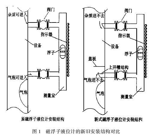 圖1高溫型磁翻板液位計的新舊安裝結(jié)構(gòu)對比氣相總是要向上方或斜上方運動,這樣,氣相就不能置換掉下部接管中的液相,也就不能進人液位計測量室,就避免了氣泡對測量的干擾以及“亂磁”現(xiàn)象的產(chǎn)生。