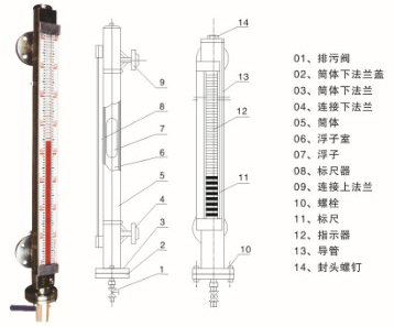 磁翻板液位計(也可稱為磁性浮子液位計)根據浮力原理和磁性耦合作用研制而成。當被測容器中的液位升降時,液位計本體管中的磁性浮子也隨之升降,浮子內的永久磁鋼通過磁耦合傳遞到磁翻柱指示器,驅動紅、白翻柱翻轉180°,當液位上升時翻柱由白色轉變為紅色,當液位下降時翻柱由紅色轉變為白色,指示器的紅白交界處為容器內部液位的實際高度,從而實現液位清晰的指示。