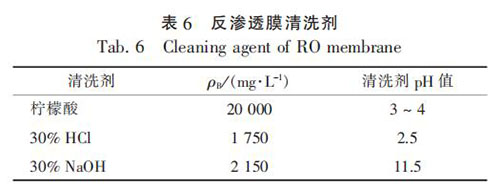 反滲透膜運行一定時間后, 污染物會在膜表面沉積, 需要定期進行化學清洗以完全恢復膜性能。 本系統設計清洗周期為 3 個月, 清洗包括循環、 浸泡、 沖洗 3 個過程, 將清洗劑引入反滲透膜 組 , 按 每 支 膜 11.4 L / min 的 流 量 循 環 5 ~ 15min, 再將單支膜流量調至 22.8 L / min 循環 5 ~ 15min, 然后再將單支膜流量調至 35 L / min 循環 30 ~60 min, 隨后進入浸泡階段, 1 ~ 2 h 后進行沖洗,直至濃水電導率與進水電導率相同。 反滲透膜采用先酸洗后堿洗的步驟進行, 酸洗和堿洗均經過上述過程, 酸洗劑可選用檸檬酸或 HCl, 堿洗劑選用 NaOH。 清洗劑選擇見表 6。