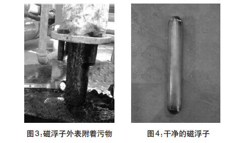 經過兩年多運行,污水罐內可能沉淀污泥雜質導致液位計示數不準?,F場拆卸液位計,并且對浮球和磁浮子進行清洗。(圖3-圖4)