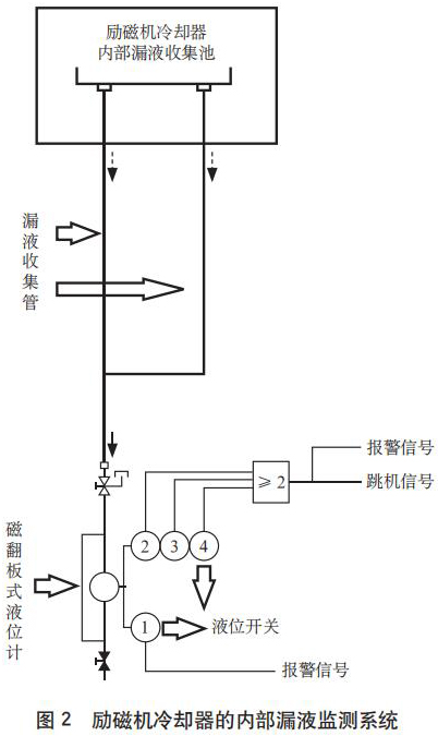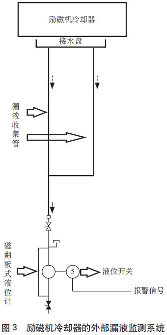 實際運行經(jīng)驗表明,側(cè)裝式磁翻板液位計內(nèi)部銅管發(fā)生泄漏的概率較低,但一旦發(fā)生泄漏,漏液會隨著冷卻空氣沿閉合風路進入勵磁機內(nèi)部,造成勵磁機短路損壞的嚴重后果。為了保證機組安全,應(yīng)有冷卻器內(nèi)部銅管泄漏監(jiān)測裝置,然而現(xiàn)場沒有配置此類裝置。