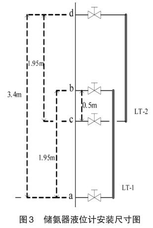 如圖3將LT-1液位計(jì)的總高度1.95m,占儲(chǔ)氨罐 a 點(diǎn)到 d 點(diǎn) 3.4m 的 57%;而 LT-2 液位計(jì)的總高度1.95m,占儲(chǔ)氨罐a到d點(diǎn)3.4m的57%;所以要將軟件數(shù)據(jù)庫內(nèi)的量程值對應(yīng)修改為:LT1量程下限:0%、量程上限 57%;LT2 量程下限:0%、量程上限57%。