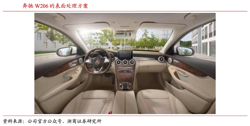 經(jīng)典案例:根據(jù)公司官方公眾號(hào)、浙商證券研究所等綜合資訊表明,均勝群英與德系品牌有較長(zhǎng)合作歷史,為其車型提供飾件。如 2021 年戴姆勒奔馳公司全球推出的車型 W206 就搭載了均勝群英最新的真木&金屬混合材料制成的表面處理方案。