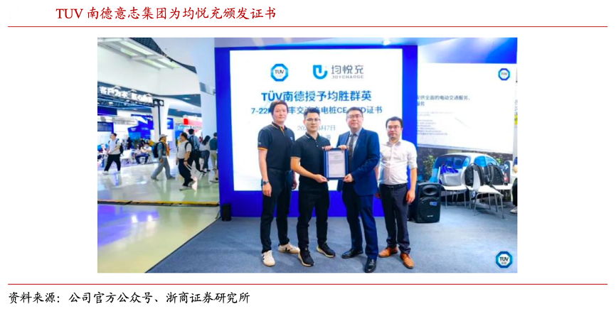 經(jīng)典案例:根據(jù)公司官方公眾號(hào)、浙商證券研究所等綜合資訊表明,均悅充旗下的充電 樁、隨車充等產(chǎn)品系列獲得了 CQC 認(rèn)證,提升產(chǎn)品的市場(chǎng)整體競(jìng)爭(zhēng)能力。此外,均悅充旗 下“均悅·享”智能交流樁、隨車充等多產(chǎn)品在 2022 年獲得歐標(biāo)認(rèn)證,為進(jìn)軍歐洲市場(chǎng)提供基礎(chǔ)。2023 年 6 月 7 日,均悅充旗下 7-22kW 功率交流充電樁(歐標(biāo))獲得了 TUV 南德意志集團(tuán)頒發(fā)的“TUV 南德安全認(rèn)證”及“CE-RED”證書(shū),再一次證明了公司的研發(fā)實(shí)力,彰顯產(chǎn)品核心競(jìng)爭(zhēng)力。