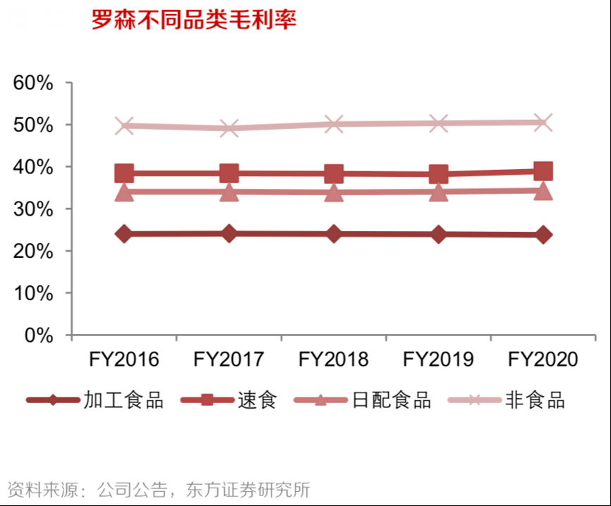 經(jīng)典案例:根據(jù)公司官網(wǎng)、東方證券研究所等綜合資訊表明,從羅森的分品類毛利率來看,其加工食品毛利率僅為約 22%,而速食和日配食品毛利率分別能夠達(dá)到約 34%和 39%。