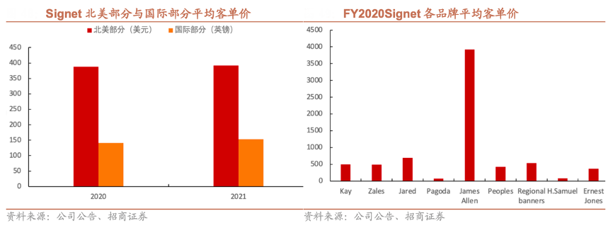 經(jīng)典案例:根據(jù)公司公告、招商證券等綜合咨詢表明,Signet 大部分子品牌平均客單價(jià)在 1000 美元以下,定價(jià)較低以吸引更多的顧客,偏向“薄利多銷”。2021 財(cái)年,Signet 北美部分的客單價(jià)為 392 美元,國際部分的為 153 英鎊。Tiffany 產(chǎn)品單價(jià)在 3100-30 萬美元之間不等。相較于 Tiffany, Signet 客單價(jià)相對(duì)較低且每年的變化較小。