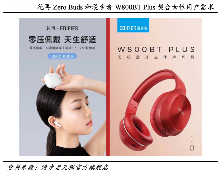 經(jīng)典案例:根據(jù)漫步者天貓官方旗艦店、方正證券研究所等綜合資訊表明,漫步者公司于2022 年 6 月公司發(fā)布花再 Zero Buds TWS 耳機,產(chǎn)品單耳機僅重 3.5g,使用半入耳零壓佩戴技術(shù),延續(xù)方圓美感線條設(shè)計,配色包括荼白、雅粉、鴉青 3 種,在產(chǎn)品體積重量和外觀方面都更加契合女性的需求和審美。