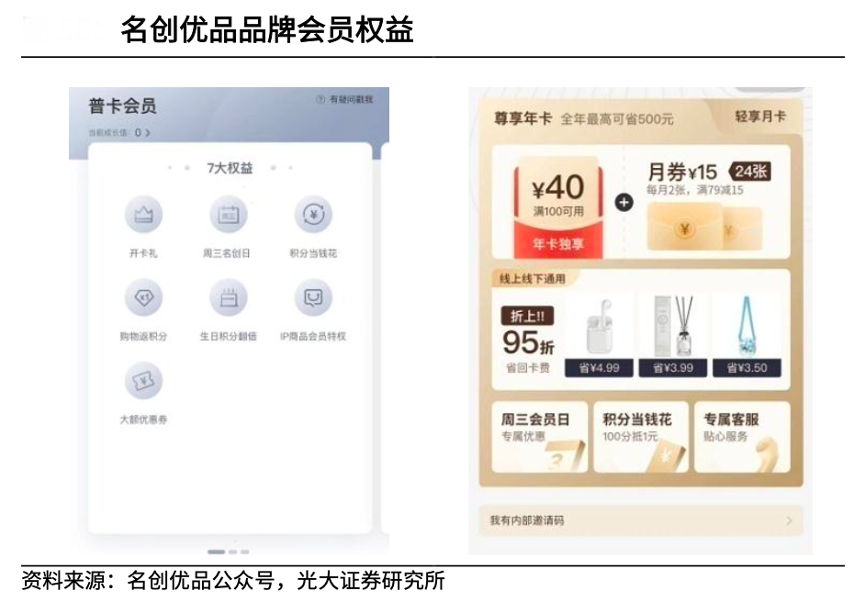 經(jīng)典案例:根據(jù)名創(chuàng)優(yōu)品公眾號、光大證券研究所等綜合資訊表明,除了基礎的免費會員,名創(chuàng)優(yōu)品也于 2021 年 4 月推出了需要繳納會員費的優(yōu)+會員計劃。相比免費會員,優(yōu)+會員享受更多的折扣與優(yōu)惠券,且可以享受精選商品的特殊價格,具有專屬客服服務。截至 2021 年底,名創(chuàng)優(yōu)品的優(yōu)+會員數(shù) 已經(jīng)達到 30.5 萬人,1HFY2022 優(yōu)+會員的 GMV 達到 1.1 億元。