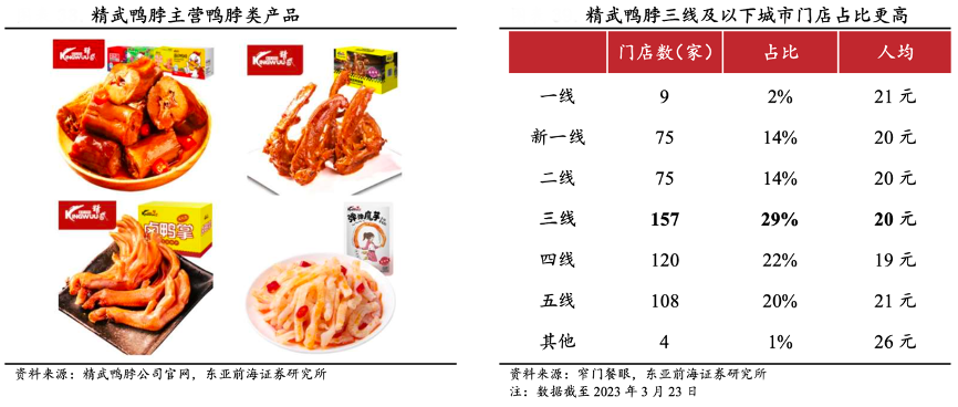 經(jīng)典案例:根據(jù)精武鴨脖公司官網(wǎng)、東亞前海證券研究所、窄門餐眼等綜合資訊表明,精武鴨脖成立于 1991 年,主要經(jīng)營(yíng)休閑鴨脖類產(chǎn)品,截至 2023 年 3 月 23 日,其在全 國(guó)范圍內(nèi)已有 548 家門店,覆蓋了全國(guó) 30 個(gè)省份和 189 個(gè)城市。其中湖州、武漢和杭州為門店數(shù)量最多的城市。精武鴨脖的平均客單價(jià)在 20 元左右,顯著低于鹵味龍頭企業(yè) 30+元的客單價(jià)水平。