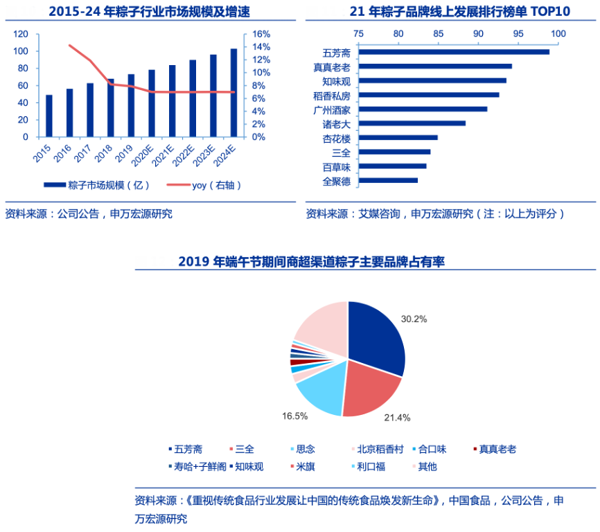 經(jīng)典案例:根據(jù)艾媒咨詢的評(píng)選,2021 年端午節(jié)粽子品牌線上評(píng)選中,排名前三的品牌分別為五芳齋、真真老老及知味觀。從歷年相關(guān)品牌評(píng)選來(lái)看,五芳齋以絕對(duì)優(yōu)勢(shì)蟬聯(lián)排行榜第一,粽子行業(yè)龍頭地位穩(wěn)固。在線下銷售方面,根據(jù)全國(guó)連鎖店超市信息網(wǎng)數(shù)據(jù),2019 年端午節(jié)期間,商超渠道粽子銷售前三名品牌分別是五芳齋、三全和 思念,其中五芳齋同樣以絕對(duì)的份額優(yōu)勢(shì)排名銷售第一。