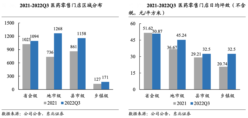 經(jīng)典案例:根據(jù)公司公告、東北證券等綜合資訊表明,2022 年,健之佳公司重點(diǎn)加強(qiáng)地級(jí)、縣級(jí)城市滲透力度,新增 門店主要分布于下沉市場(chǎng),公司由省會(huì)城市向地、縣級(jí)城市滲透的門店布局已形成 一定規(guī)模,區(qū)域門店密度進(jìn)一步提升。截至 2022Q3 末,省會(huì)級(jí)公司醫(yī)藥零售門店 數(shù)為 1,094 家,占比 29.64%,地市級(jí)門店數(shù)為1,268 家,占比 34.35%。同時(shí),門店日均 坪效提升,尤其是鄉(xiāng)鎮(zhèn)級(jí)別門店坪效從 2021 年從 20.74 元/平方米提高到 2022Q3 的 32.5 元/平方米,提高幅度達(dá) 56.7%,下沉市場(chǎng)門店效率提升明顯。