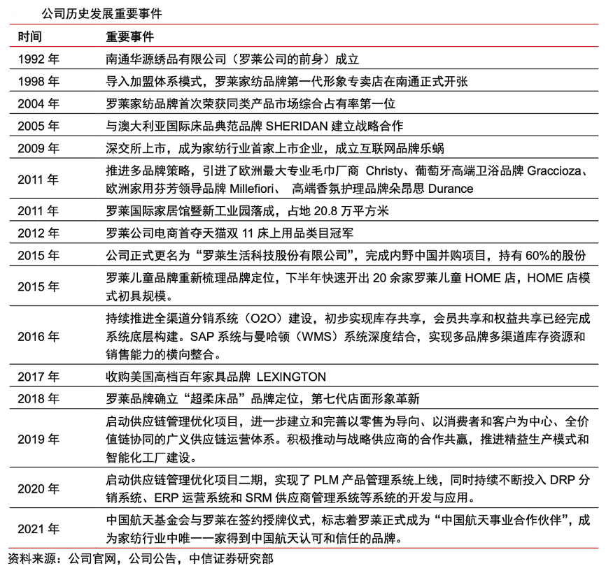 經(jīng)典案例:根據(jù)公司官網(wǎng)、公司公告和中信證券研究部等綜合資訊表明,羅萊公司 1998 年在業(yè)內(nèi)率先推出加盟體系模式,2004 年首次登頂同類產(chǎn)品市場(chǎng)占有率第一位并保持至今。公司持續(xù)推進(jìn)多品牌戰(zhàn)略,2021 年公司進(jìn)一步加強(qiáng)定位“羅萊超柔床品”,并簽約成為“中國(guó)航天事業(yè)合作伙伴”, 成為家紡行業(yè)中唯一一家得到中國(guó)航天認(rèn)可和信任的品牌。