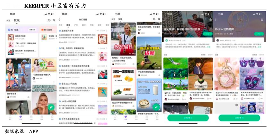 經(jīng)典案例:根據(jù)APP、國泰君安證券研究等綜合資訊表明,KEEP 平臺擁有中國最大的在線健身用戶群,圍繞健身建立小區(qū)是其對核心健身體驗的有力補充,使其具有更強的激勵作用、更激烈的競技感及更緊密的相互聯(lián)系。2022 年 Keeper 小區(qū)的互動(包括帖子、點贊和評論)總數(shù)達 11 億次。