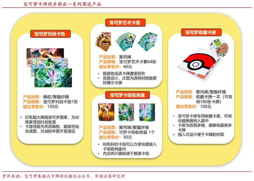 經(jīng)典案例:根據(jù)寶可夢(mèng)集換式卡牌游戲微信公眾號(hào)、華源證券研究所等綜合資訊表明,寶可夢(mèng)卡牌推出一系列周邊產(chǎn)品,包括寶可夢(mèng)對(duì)戰(zhàn)卡墊、寶可夢(mèng)藝術(shù)卡套、寶可夢(mèng)卡組收納盒、寶可夢(mèng)收藏 卡冊(cè)等,價(jià)格在 30 至 150 元不等。