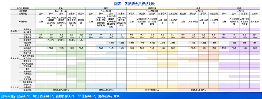 經(jīng)典案例:根據(jù)亞朵APP、錦江酒店APP、首旅如家APP、華住會APP、國海證券研究所等綜合資訊表明,亞朵A-Card會員權(quán)益跳出傳統(tǒng)酒店場景,延伸至出行、閱讀、會議、餐飲以及新零售等多個生活場景,可滿足更多元的消費需求。亞朵的A-Card會員除會員積分、 會員價格、預(yù)定保留、延遲退房等傳統(tǒng)酒店權(quán)益外,還可以享受多項區(qū)別于其余四家酒店會員的獨特禮遇,如書籍借閱、門店活動、會議室、專屬管家、酒廊使用權(quán) 等。