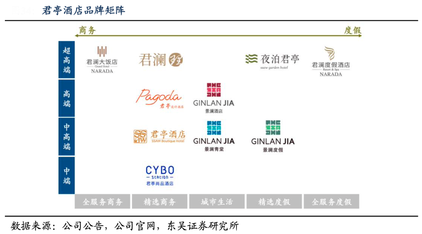 經(jīng)典案例:根據(jù)公司公告、公司官網(wǎng)、東吳證券研究所等綜合資訊表明,截至 2022 年 2 月,君瀾品牌布局浙江、江蘇、海南等超 23 個(gè)省市,累計(jì)投資管理超過 180 家酒店,景瀾布局遍及浙江、海南、吉林等 13 個(gè)省市,累計(jì)投資管理酒 店 75 家。收購?fù)瓿珊?,君亭?shí)現(xiàn)規(guī)模躍遷,正式躋身于國內(nèi)民族酒店集團(tuán)前列,至此,君亭的品牌矩陣進(jìn)一步完善,完成對(duì)中高端和高端商務(wù)以及休閑品牌的全覆蓋。