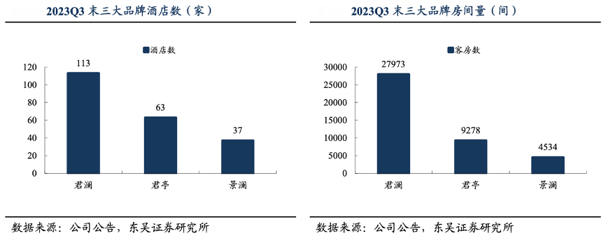經(jīng)典案例:根據(jù)公司公告、東吳證券研究所等綜合資訊表明,君亭君瀾旗下包含“君瀾大飯店”、“君瀾度假酒店”以及“君瀾理”,領(lǐng)銜高端度假、商旅酒店行業(yè)。景瀾源于君瀾,定位中高端社區(qū)生活酒店,發(fā)展出“景瀾酒店”、“景瀾度假”以及“景瀾青棠”。截至 2023 年 Q3 末,君瀾、君亭與景瀾開業(yè)酒店數(shù)分別為 113/63/37 家,房間數(shù)分別為 27973/9278/4534 間。三大品牌定位互補(bǔ),深耕高端度假與商旅酒店市場。