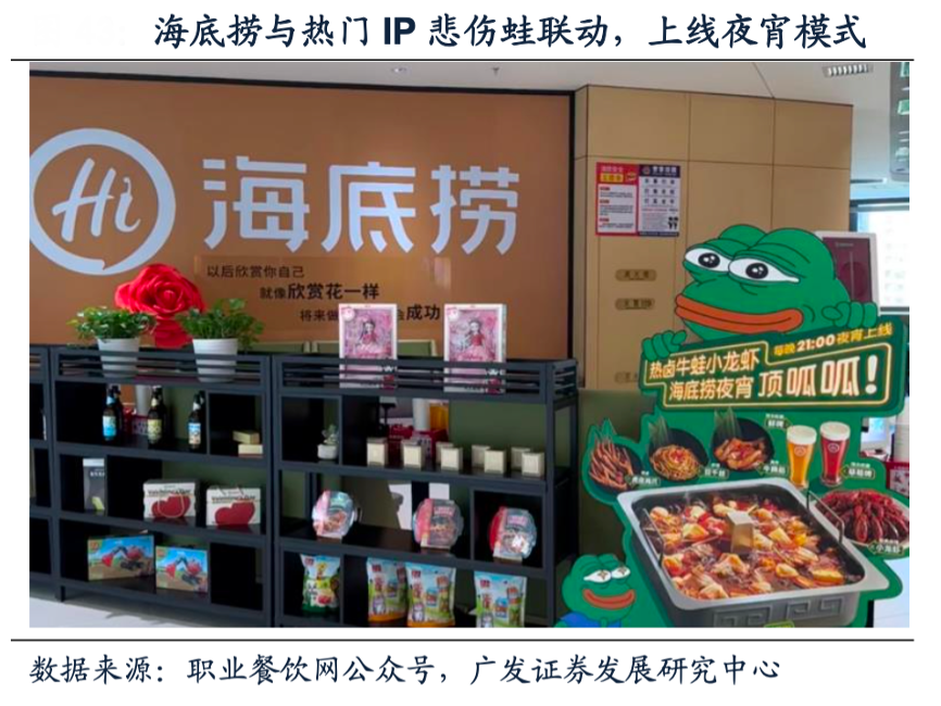 經(jīng)典案例:根據(jù)職業(yè)餐飲網(wǎng)公眾號(hào)、廣發(fā)證券發(fā)展研究中心等綜合資訊表明,2023年暑期海底撈近1000家門店每晚上線夜宵,增加小龍蝦、鹵味、牛蛙鍋、精釀啤酒等產(chǎn)品,聯(lián)動(dòng)熱門IP悲傷蛙,每晚定時(shí)發(fā)起猜拳活動(dòng)。