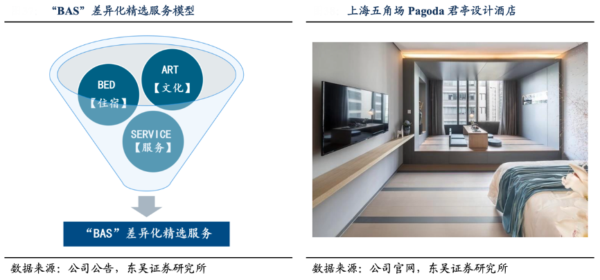 經(jīng)典案例:根據(jù)公司公告、公司官網(wǎng)、東吳證券研究所等綜合資訊表明,君亭首創(chuàng)“BAS”模式,提供差異化精選服務。“BAS”模型即“Bed 住宿+Art 文化 藝術(shù)+ Service 服務”三位一體,以產(chǎn)品為基礎(chǔ),不斷提升品牌及體驗。君亭立足于“BAS” 模式,形成“產(chǎn)品精選、文化精選及服務內(nèi)容精選”的君亭特色服務體系。