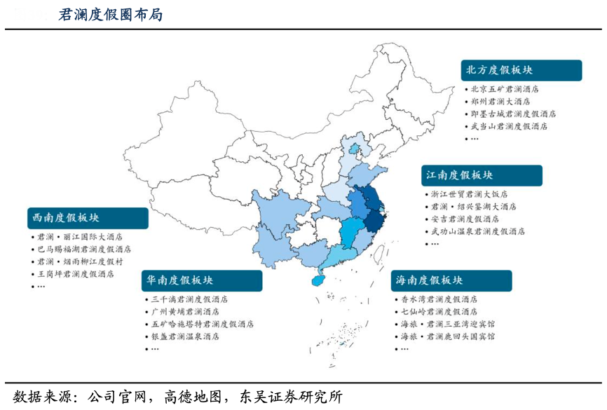 經(jīng)典案例:根據(jù)公司官網(wǎng)、高德地圖、東吳證券研究所等綜合資訊表明,君瀾依托濱海、溫泉、古城古鎮(zhèn)等優(yōu)質(zhì)旅游目的地,整合景區(qū)和物業(yè)資源,打造“四南一北”全國度假圈布局,有機結(jié)合中 國各地地域文化、民族文化以及特色文化,為消費者提供類別豐富的高端休閑度假產(chǎn)品。