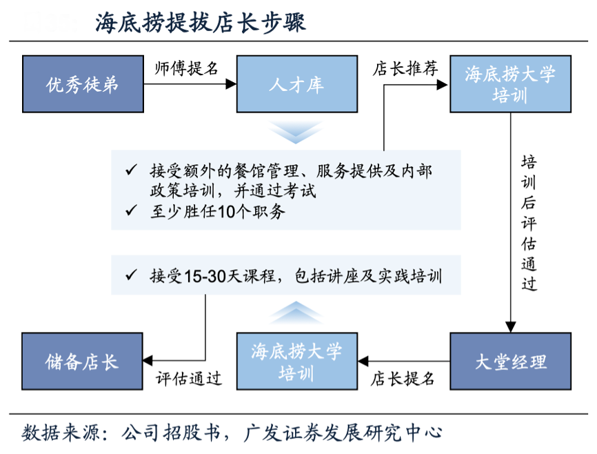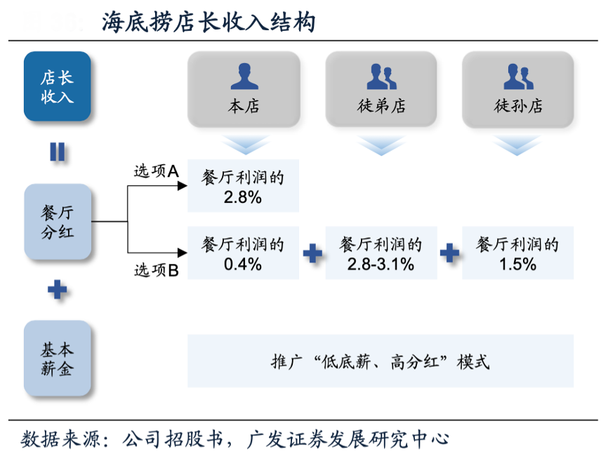 經(jīng)典案例:根據(jù)公司招股書、廣發(fā)證券發(fā)展研究中心等綜合資訊表明,海底撈“師徒制”深度綁定店長(zhǎng)與公司的利益,據(jù)公司招股書及財(cái)報(bào),主要經(jīng)營(yíng)人員采取“低底薪、高分紅”薪酬制度,分紅方面,店長(zhǎng)可分享餐廳利潤(rùn)的2.8%,或者分享餐廳利潤(rùn)的0.4%+徒弟店利潤(rùn)的2.8-3.1%+徒孫店利潤(rùn)的1.5%,從而激勵(lì)店長(zhǎng)為公司培養(yǎng)人才。