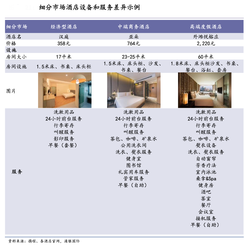 經(jīng)典案例:根據(jù)攜程、各酒店官網(wǎng)、浦銀國(guó)際等綜合資訊表明,高端度假酒店滿足高端人士對(duì)居住環(huán)境和服務(wù)的高需求,酒店周邊風(fēng)景更加怡人,客房更大、服務(wù)更客制化。相比高端酒店,經(jīng)濟(jì)型酒店所提供的設(shè)施以及服務(wù)相對(duì)有限,但也能滿足普通商旅和休閑消費(fèi)者的基本需求。