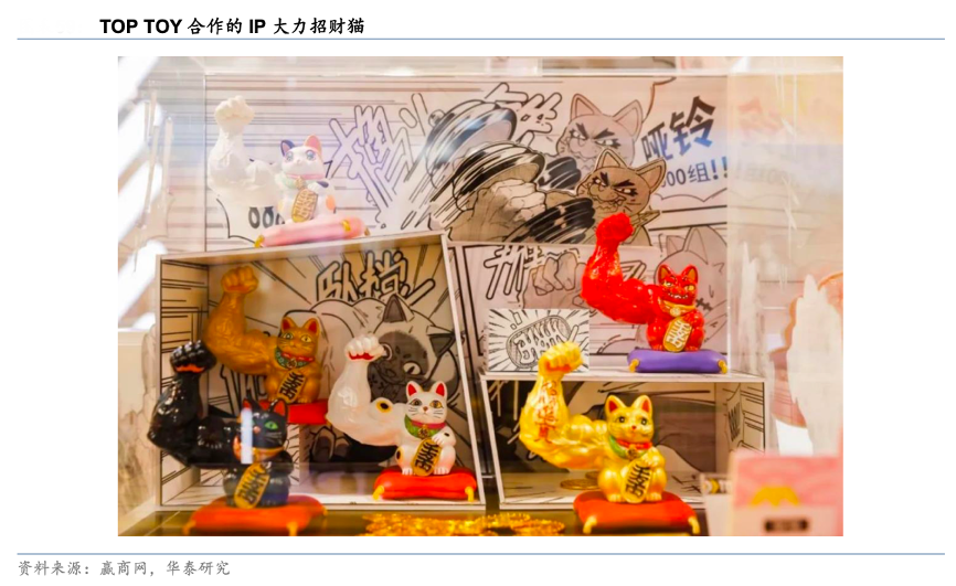 經(jīng)典案例:根據(jù)贏商網(wǎng)、華泰研究等綜合資訊表明,截至 2022 年 12 月 31 日,TOP TOY 已與 20 位 IP 許可方聯(lián)名開(kāi)發(fā)出 300 逾款 TOP TOY 品牌下的 IP 產(chǎn)品。 以暢銷(xiāo)款 IP 大力招財(cái) 貓為例,TOP TOY 便是直接與藝術(shù)家徐振邦進(jìn)行合作,通過(guò)供應(yīng)鏈與營(yíng)銷(xiāo)的賦能,將 IP 與產(chǎn)品結(jié)合推向消費(fèi)者。