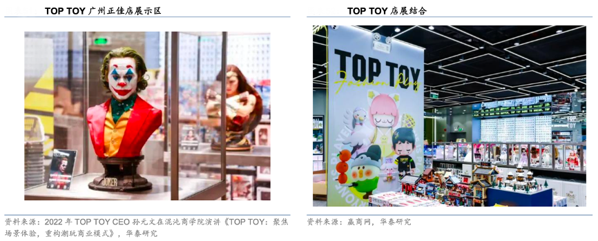 經(jīng)典案例:根據(jù)贏商網(wǎng)、2022年TOP TOY CEO孫元文在混沌商學(xué)院演講《TOP TOY:聚集場(chǎng)景體驗(yàn),重構(gòu)潮玩商業(yè)模式》、華泰研究等綜合資訊表明,TOP TOY 采用“店展結(jié)合”的模式,以廣州正佳店為例,門(mén)店用 1/3 的黃金位置用于產(chǎn)品的展示而不做產(chǎn)品銷(xiāo)售,從選址到門(mén)頭、設(shè)計(jì)、人流、導(dǎo)購(gòu)服務(wù)、 陳列、打卡點(diǎn),TOP TOY 對(duì)門(mén)店各個(gè)環(huán)節(jié)進(jìn)行精心設(shè)計(jì)。