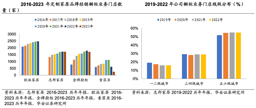 經(jīng)典案例:根據(jù)志邦家居2016-2023歷年年報、歐派家居2016-2023歷年年報、金牌櫥柜2016-2023歷年年報、索菲亞家居2016-2023歷年年報、華安證券研究所等綜合資訊表明,志邦家居積累了大量優(yōu)質(zhì)經(jīng)銷商與門店資源,2024Q1 公司櫥 柜經(jīng)銷門店數(shù)量 1759 家,較 2023 年末增加 44 家,門店數(shù)量有所擴(kuò)張。從門店線級分布來看,2022 年公司經(jīng) 銷渠道櫥柜業(yè)務(wù)一二級城市收入占 16%,三四級城市收入占 29%,五六級城市收 入占 55%,渠道不斷下沉。