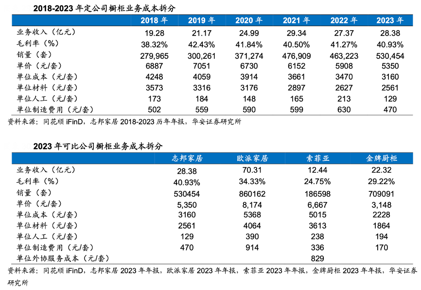 經(jīng)典案例:根據(jù)志邦家居2018-2023歷年年報、志邦家居2023年年報、歐派家居2023年年報、索菲亞2023年年報、金牌櫥柜2023年年報、同花順iFinD、華安證券研究所等綜合資訊表明,志邦家居公司業(yè)務(wù)規(guī)模持續(xù)擴(kuò)張,2023 年公司櫥柜業(yè)務(wù)毛利率為 40.93%,同期歐派家居/金牌廚柜/索菲亞/皮阿諾/好萊客 廚柜業(yè)務(wù)毛利率分別為 34.33%/29.22%/24.75%/26.95%/26.07%,顯著領(lǐng)先于行業(yè)競爭對手。
