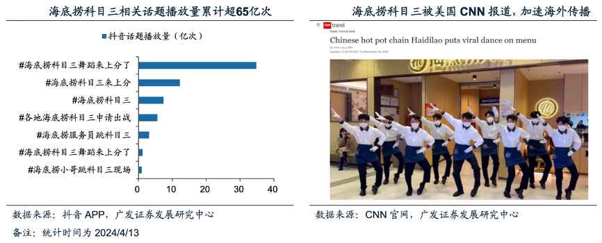 經(jīng)典案例:根據(jù)抖音APP、CNN官網(wǎng)、廣發(fā)證券發(fā)展研究中心等綜合資訊表明,除主動營銷之外,海底撈公司優(yōu)質(zhì)服務(wù)典型出圈案例為“科目三”,海底撈員工為顧客表演舞蹈后,顧客拍攝并自發(fā)上傳到社交媒體,引起 廣泛傳播,據(jù)抖音APP,截至2024年4月13日,抖音平臺海底撈科目三相關(guān)話題累計播放量超65億次,成為現(xiàn)象級事件。同時海底撈科目三也被美國CNN報道,加速其在海外的傳播。