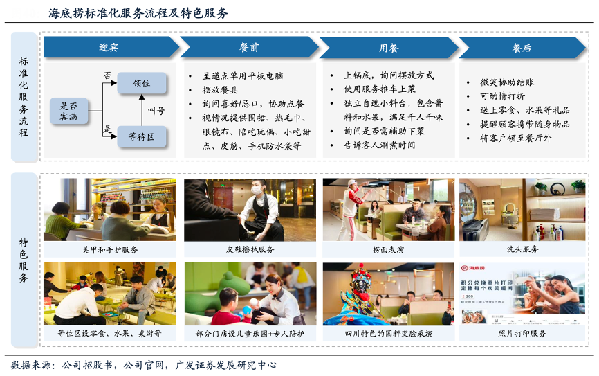 經(jīng)典案例:根據(jù)公司招股書、公司官網(wǎng)、廣發(fā)證券發(fā)展研究中心等綜合資訊表明,本著以客為本的文化,海底撈致力于在就餐的每個環(huán)節(jié)為顧客提供周到、貼心和個性化的服務。在客人 落座后,海底撈細致入微的服務貫穿了顧客點餐、用餐的每個環(huán)節(jié),如提供熱毛巾、圍裙、手機套、撈面表演和京劇表演等,海底撈還給予員工較大自由度,讓員工可以創(chuàng)造性地為顧客提供差異化服務,如為戴眼鏡的顧客提供眼鏡布,為長發(fā)顧客提 供發(fā)帶,為帶嬰兒就餐的顧客提供嬰兒床等。