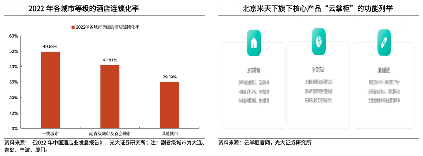 經(jīng)典案例:根據(jù)《2022年中國(guó)酒店業(yè)發(fā)展報(bào)告》、云掌柜官網(wǎng)、光大證券研究所等綜合資訊表明,2021、2022年,同程旅行先后收購(gòu)了兩家 PMS(Property management system,酒店物業(yè)管理系統(tǒng))公司——長(zhǎng)沙金天鵝(100%股權(quán)) 與北京米天下(53.5%股權(quán)),為低線城市的中小型酒店提供 SaaS 解決方案,協(xié)助其提高運(yùn)營(yíng)效率。例如,米天下推出的云掌柜民宿多終端房態(tài)管理系統(tǒng)已服 務(wù) 20 萬(wàn)家民宿,為其提供房態(tài)管理、財(cái)務(wù)統(tǒng)計(jì)、渠道直連等技術(shù)支持。