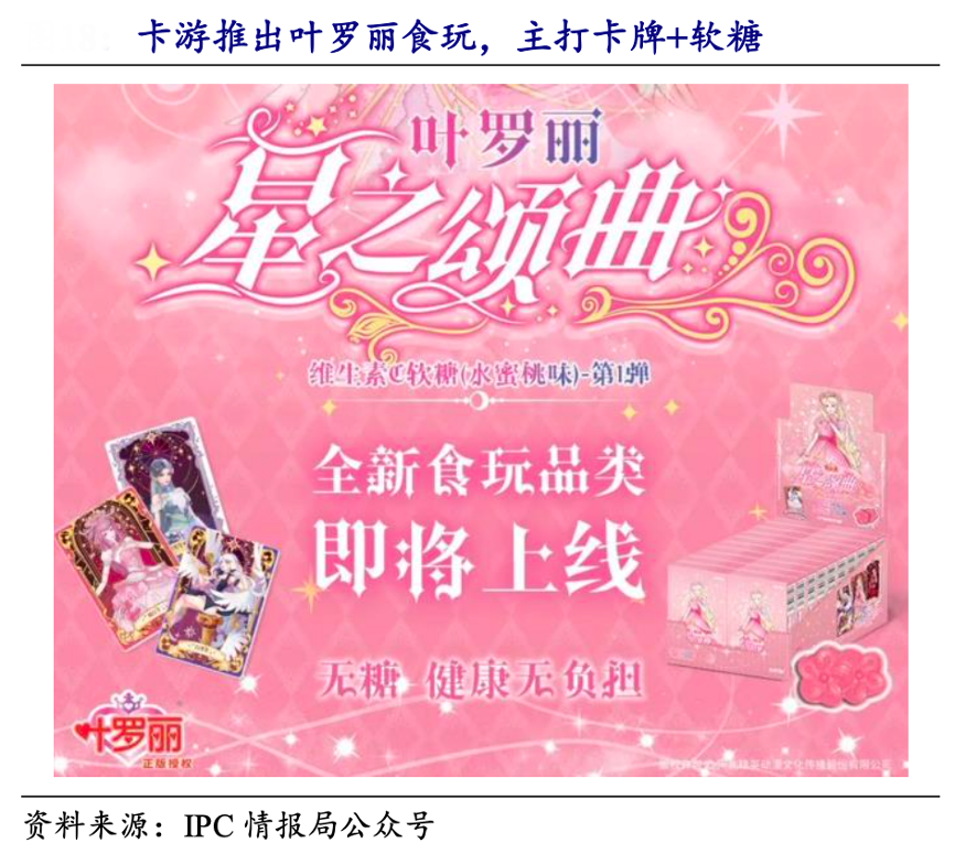 經(jīng)典案例:根據(jù)IPC情報局公眾號、開源證券研究所等綜合資訊表明,卡游在2024 年 7 月卡游向經(jīng)銷商發(fā)布了一則關于“將推出食玩類產(chǎn)品” 的公告,以提醒尚未有食品銷售資質(zhì)的經(jīng)銷商增加相關類目,從而更好地推進商品銷售。首款食玩類產(chǎn)品“葉羅麗·星之頌曲·維生素 C 軟糖 (水蜜桃味)-第一彈”已上線。