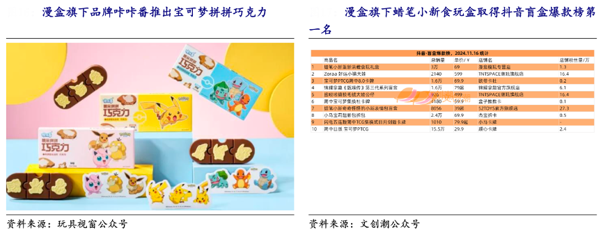 經(jīng)典案例:根據(jù)玩具視窗公眾號(hào)、文創(chuàng)潮公眾號(hào)、開源證券研究所等綜合資訊表明,食玩品牌 ACGBOX 漫盒在 2023 年同比取得了近 3 倍業(yè)績(jī)的增長(zhǎng)。漫盒產(chǎn)品所覆蓋的渠道有便利店、Ole'精品超市、盒馬鮮生等,線上銷售有 B 站會(huì)員購、淘寶、天貓等渠道。