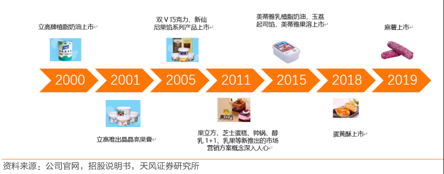 經(jīng)典案例:根據(jù)公司官網(wǎng)、招股說(shuō)明書(shū)、天風(fēng)證券研究所等綜合資訊表明,2000年立高牌植脂奶油上市為立高在行業(yè)內(nèi)占據(jù)一席之地,2001年立高推出晶晶亮果膏使得果膏蛋糕成為一個(gè)行業(yè)品類,之后雙V巧克力等產(chǎn)品逐漸上市。2018年,2019年立高又分別推出蛋黃酥和麻薯進(jìn)一步擴(kuò)寬了公司的業(yè)務(wù)。立高公司豐富的產(chǎn)品能充分滿足下游不同類型客戶的多產(chǎn)品、多規(guī)格的一站式采購(gòu)消費(fèi)需求,極大的提高了客戶的使用便利性。