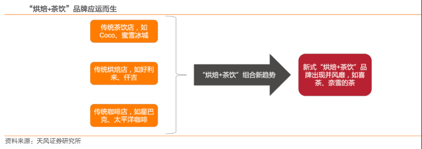 經(jīng)典案例:根據(jù)中國(guó)烹飪協(xié)會(huì)《2017年度美食消費(fèi)報(bào)告》、天風(fēng)證券研究所等綜合資訊表明,70后、80后、90后餐飲消費(fèi)中,蛋糕甜品店訂單占比分別為1%、7%、25%,年輕一代飲食西化的趨勢(shì)已經(jīng)出現(xiàn)。咖啡廳、蛋糕甜品店逐漸成為年輕人休閑放松的主要場(chǎng)所,“飲品+烘焙”成為下午茶主流。在這種趨勢(shì)下,喜茶、奈 雪的茶、樂(lè)樂(lè)茶這類以新式茶飲+烘焙為主要產(chǎn)品體系的品牌應(yīng)運(yùn)而生,星巴克、太平洋 咖啡等上線的烘焙產(chǎn)品數(shù)量逐漸增加。