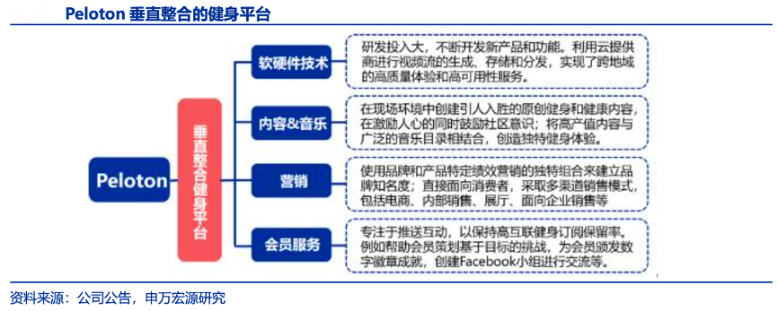 經(jīng)典案例:根據(jù)公司公告、申萬宏源研究等綜合資訊表明,相比硬件銷售,內(nèi)容訂閱業(yè)務營收占比小,毛利率高達57%,為Peloton公司持續(xù)保持競爭力的核心。平臺訂閱內(nèi)容以流媒體技術(shù)為依托,不斷向用戶提供大量原創(chuàng)健身內(nèi)容和健身音樂,并利用社交、會員服務、健身活動等營銷手段保持客戶黏性。目前,其在紐約倫敦等地均有內(nèi)容工作 室,具備每月超 950 節(jié)原創(chuàng)內(nèi)容生產(chǎn)能力。
