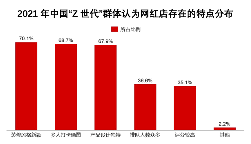 經(jīng)典案例:根據(jù)CCFA《餐飲行業(yè):2021年中國(guó)連鎖餐飲行業(yè)報(bào)告》等綜合資訊表明,新一批茶飲、網(wǎng)紅餐廳滿足了 Z 世代消費(fèi)者的顏值需求,實(shí)現(xiàn)了產(chǎn)品和品牌的迅速的打爆和擴(kuò)張。根據(jù)相關(guān)調(diào)研,Z世代群體認(rèn)為自己愿意去網(wǎng)紅店消費(fèi),主要的原因是裝修風(fēng)格新穎、能夠多人打卡曬圖和產(chǎn)品設(shè)計(jì)獨(dú)特。說(shuō)明大量 Z 世代愿意去網(wǎng)紅店 打卡主要還是因?yàn)椴蛷d/菜品的顏值和受到營(yíng)銷種草。