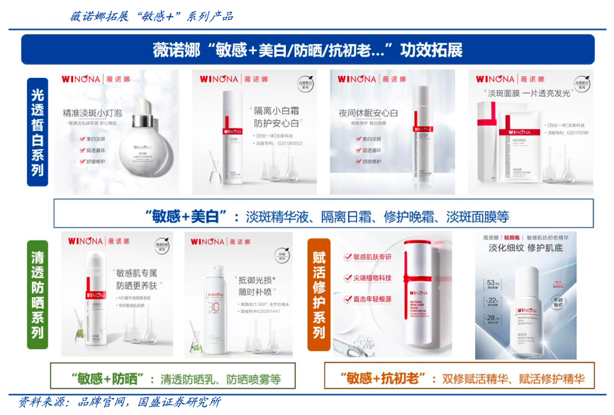 經(jīng)典案例:根據(jù)品牌官網(wǎng)、國(guó)盛證券研究所等綜合資訊表明,薇諾娜通過成功打造舒敏系列有效滿足了敏感肌人群基礎(chǔ)的屏障修護(hù)需求,進(jìn)而針對(duì)敏感肌人群的多種進(jìn) 階需求進(jìn)行布局,如美白、防曬、抗初老等,分別打造了光透皙白系列(在舒緩修護(hù)的 基礎(chǔ)上兼具美白淡斑功效)、清透防曬系列(溫和穩(wěn)定,無需卸妝)、賦活精華液(可在 修護(hù)維穩(wěn)的同時(shí)實(shí)現(xiàn)抗初老功效)。通過功效不斷延申,覆蓋敏感肌用戶多重使用場(chǎng)景,其深化品牌敏感肌專家形象的同時(shí)打造銷售端高天花板。