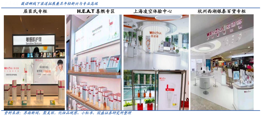 經(jīng)典案例:根據(jù)界面新聞、聚美麗、化妝品觀察、小紅書、國(guó)盛證券研究所等綜合資訊表明,薇諾娜在 H.E.A.T 喜燃等美妝集 合店中設(shè)立專區(qū)拓展線下渠道模式;2021年9月于上海開設(shè)全國(guó)首家線下體驗(yàn)中心,提供產(chǎn)品展示、肌膚檢測(cè)等專業(yè)化的肌膚綜合服務(wù)方案;12月于杭州西湖銀泰設(shè)立全國(guó)首個(gè)百貨專柜,首次線下發(fā)布“緊致修護(hù)系列”產(chǎn)品并在專柜內(nèi)設(shè)立肌膚檢測(cè)服務(wù)區(qū),樹立國(guó)貨品牌線下銷售新標(biāo)桿。