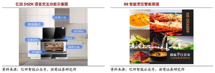 經(jīng)典案例:根據(jù)億田智能公眾號(hào)、浙商證券研究所等綜合資訊表明,2019年,億田智能公司開(kāi)創(chuàng)式研發(fā)出蒸烤獨(dú)立款集成灶。2020年5月,其和天貓精靈合作發(fā)布行業(yè)第一臺(tái)嚴(yán)格意義上具有成熟語(yǔ)音交互功能的云智能產(chǎn)品——“天貓精靈蒸奇妙”D5Z蒸箱款集成灶。2021 年 5 月,億田發(fā)布智能烹飪管家 S9,集成了煙機(jī)、灶具、蒸箱(與冰箱一體)、保鮮柜、煮飯機(jī)器人,其中冰蒸一體為行業(yè)首創(chuàng),并能以 APP 遠(yuǎn)程控制,引領(lǐng)產(chǎn)品大增長(zhǎng),刷新新一代產(chǎn)品認(rèn)知。