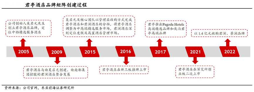 經(jīng)典案例:根據(jù)公司官網(wǎng)、東亞前海證券研究所等綜合資訊表明,2017年,君亭豐富品牌矩陣,推出 Pagoda Hotels 高端精選品牌和夜泊君亭高端品牌,提升品牌調(diào)性。2022 年 1 月 21 日,君亭酒店以 1.4 億收購君瀾79%股權(quán)和景瀾70%股權(quán),持續(xù)推進高端化布局。