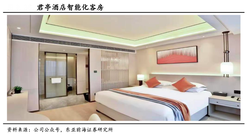 經(jīng)典案例:根據(jù)公司公眾號、東亞前海證券研究所等綜合資訊表明,君亭酒店充分融合物聯(lián)網(wǎng)技術(shù)對酒店客房的家電、家具、燈光、公共區(qū)域視頻監(jiān)控等實現(xiàn)智能控制,目前旗下部分酒店已率先實現(xiàn)智慧酒店場景建設,例如住宿客人可以根據(jù)喜好智能調(diào)節(jié)客房燈光、溫度、窗簾開關(guān)、多媒體設備操作等,與阿里未來酒店合作在部分酒店加裝智能電子感應門鎖,注重于客戶的互動方式與 個性化體驗的提升。