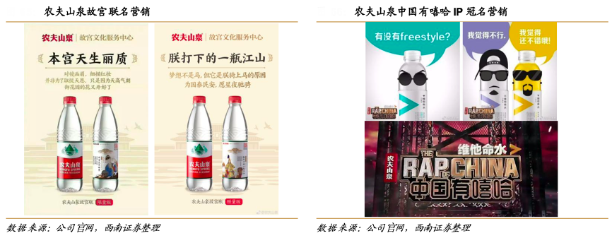 經(jīng)典案例:根據(jù)公司官網(wǎng)、西南證券等綜合資訊表明,2017年,農(nóng)夫山泉牽手故宮文化服務(wù)中心,推出 9 款限量款故宮瓶,以清代帝王人物形象配上“朕打下的一瓶江山”等文案,主動出擊年輕文化。農(nóng)夫山泉通過整合內(nèi)容營銷與知名 IP 的深度捆綁,對產(chǎn)品進行高強度曝光并全面提升認知度。一方面,農(nóng)夫山泉借力打造契合年輕消費者活力形象的爆款單品;另一方面,依托 IP 文化感染力,吸引受眾將注意力和好感度從節(jié)目和文化本身,轉(zhuǎn)移到對產(chǎn)品、品牌的關(guān)注和購買。
