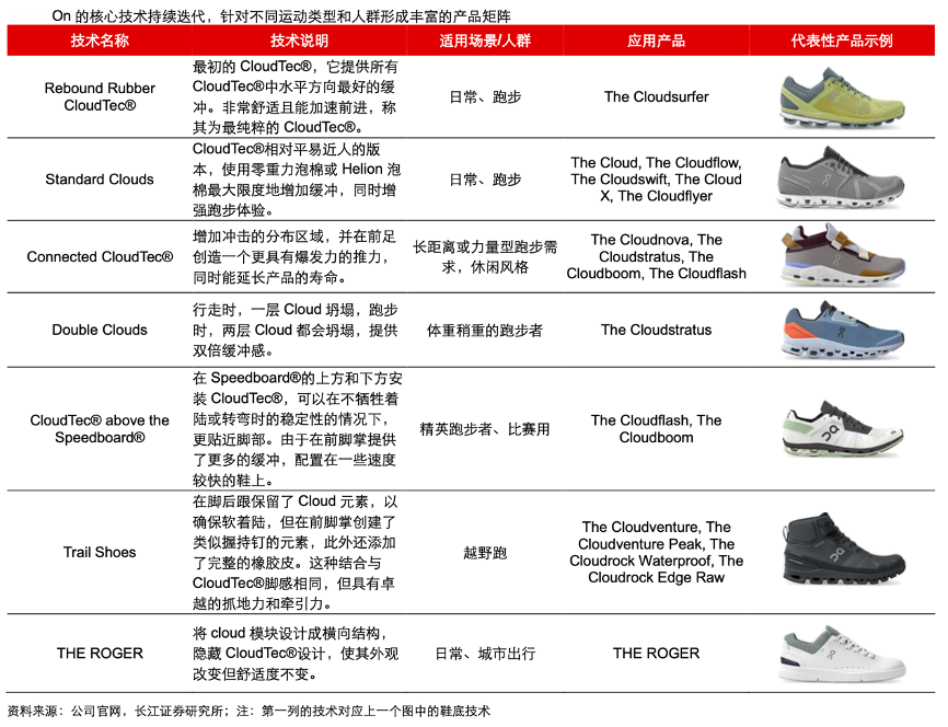 經(jīng)典案例:根據(jù)公司官網(wǎng)、長(zhǎng)江證券研究所等綜合資訊表明,On旗下所有鞋款均搭載 CloudTec 結(jié)構(gòu)緩震專利科技,分布在鞋底的 Cloud 模塊在足部觸地時(shí)通過(guò)水平和垂直雙重作用力帶來(lái)輕盈觸地的突破性緩震體驗(yàn),同時(shí)牢牢鎖住著陸時(shí)產(chǎn)生的壓力,并迅速將其轉(zhuǎn)化為蹬腳推進(jìn)時(shí)的疾速爆發(fā)。在 CloudTec 基礎(chǔ)上衍生出了 Double Clouds 等技術(shù),應(yīng)用于多個(gè)鞋款。