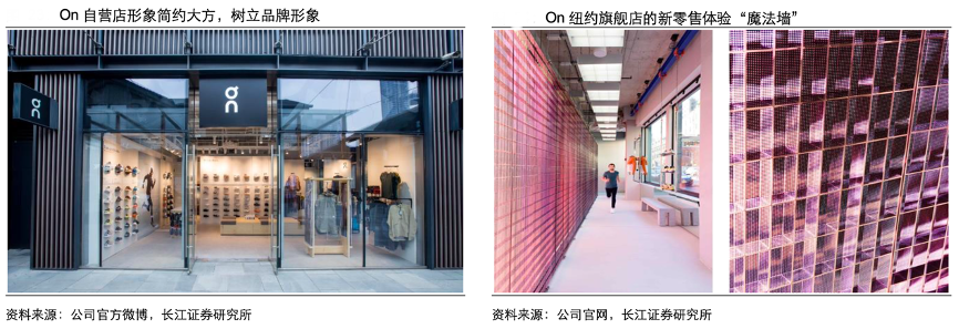 經(jīng)典案例:根據(jù)公司官方微博、公司官網(wǎng)、長江證券研究所等綜合資訊表明,On旗艦店和自營店主要起梳理品牌形象和培育消費(fèi)者品牌認(rèn)知的作用,adw 選址位于核心商圈且店鋪形象簡約,并以新零售體驗(yàn)向消費(fèi)者傳遞品牌的科技概念,如紐約旗艦店的“魔法墻”實(shí)時掃描購物者的跑步風(fēng)格,以幫助他們找到適合其跑步風(fēng)格和需求的鞋款。