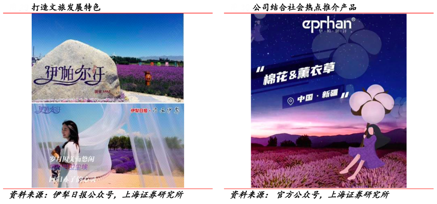 經(jīng)典案例:根據(jù)伊犁日?qǐng)?bào)公眾號(hào)、官方公眾號(hào)、上海證券研究所等綜合資訊表明,伊帕爾汗線下簽約數(shù)十家 CS 渠道代理商,線上布局多個(gè)新媒體平臺(tái)和電商平臺(tái),通過(guò)直播、社群、福瑞達(dá)DTC品牌集群等渠道來(lái)進(jìn)行拓展。線下與新疆農(nóng)業(yè)、文旅部門(mén)等緊密合作,結(jié)合中國(guó)新疆產(chǎn)地優(yōu)勢(shì)塑造品牌特色,以中 國(guó)薰衣草原產(chǎn)地溯源性標(biāo)簽的 4A 級(jí)景區(qū)形象,通過(guò)線上文旅資源云展和線下制造業(yè)展播,打造薰衣草文旅融合雙發(fā)展。
